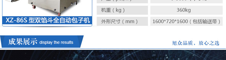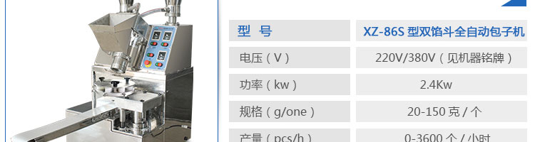 名稱XZ-86S型雙餡斗全自動包子機 電源220/380V(見機器名牌) 功率2.4kw 產(chǎn)量0-3600個/小時 尺寸1600*720*1600mm(包括輸送帶) 重量360kg 規(guī)格20-150克/個 其他