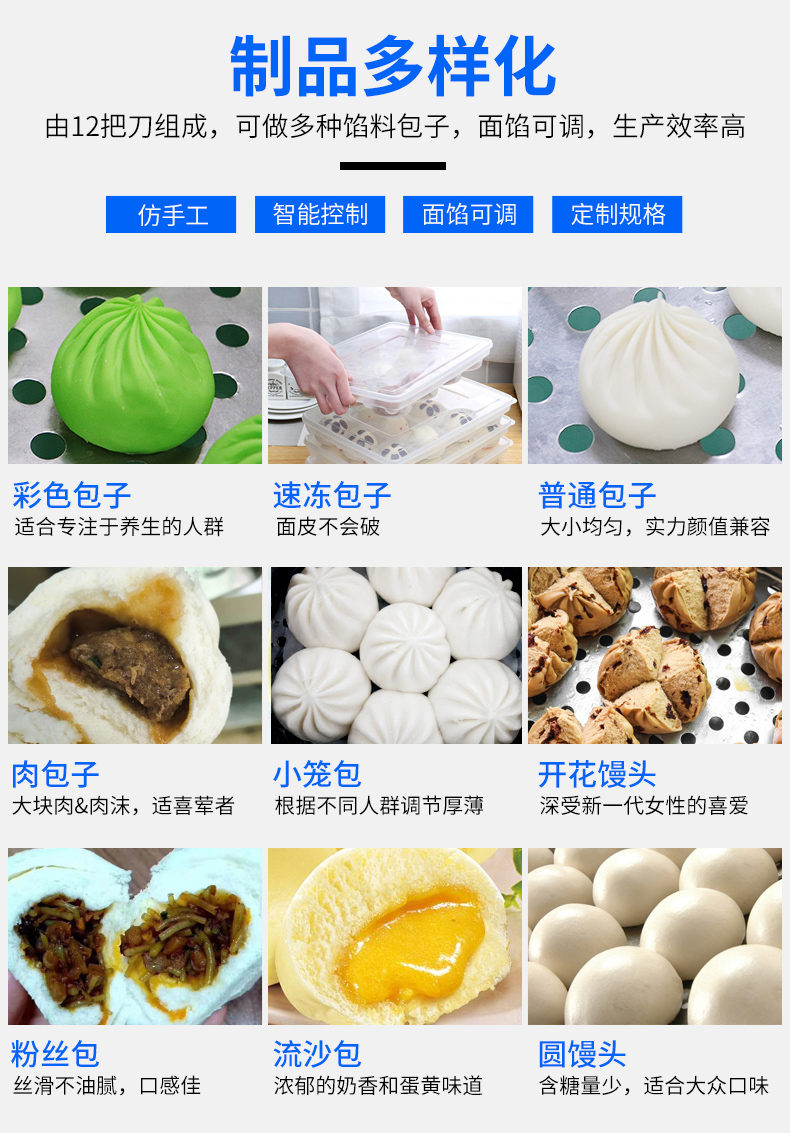 名稱XZ-290A智能型卷面包子機(jī) 電源220V/380V 功率3.3KW 產(chǎn)量0-3600個(gè)/h 尺寸26801500×1420mm(包括輸送帶) 重量420KG 規(guī)格25-130g/個(gè) 其他