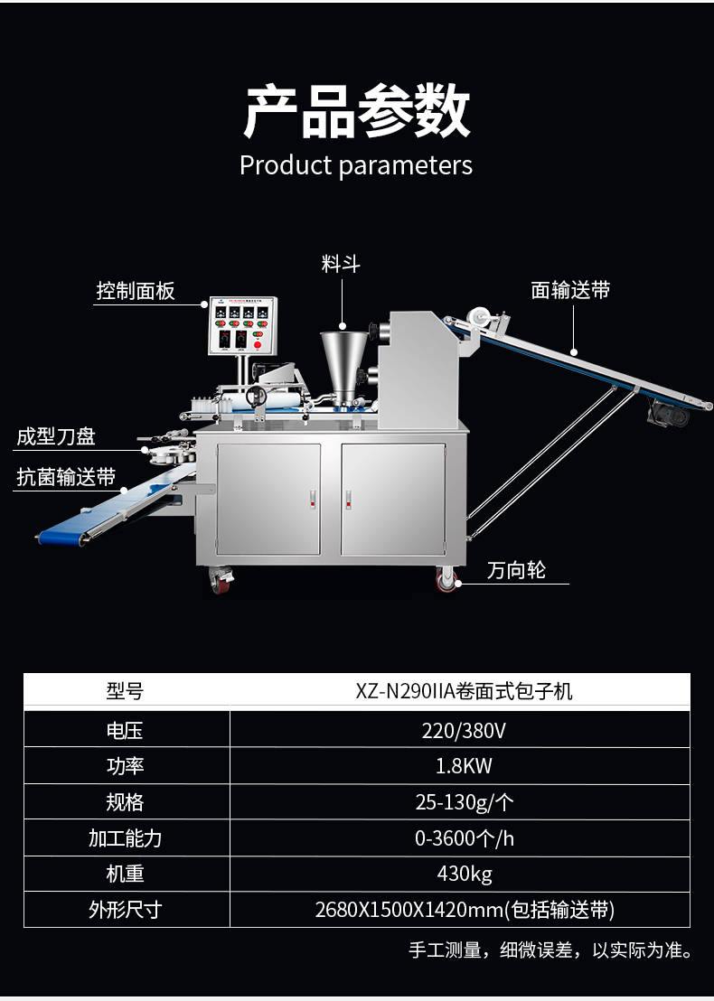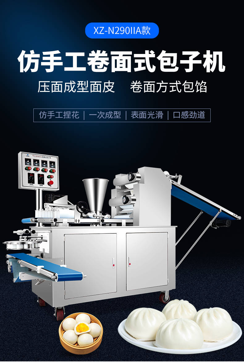 XZ-N290IIA卷面式包子機,壓面成型面皮,卷面方式包餡。仿手工捏花、一次成型、表面光滑、口感勁道。面餡可調(diào)、制品多樣。產(chǎn)品重量精度高,規(guī)格,大小,面皮的厚度皆可調(diào)控。