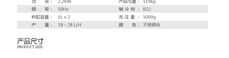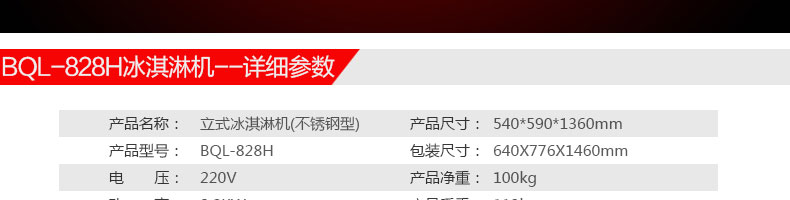 名稱BQL-828H立式冰淇淋機 電源220V 功率2.2kw 產量18-28L/h 尺寸540*590*1360mm 重量119kg 規(guī)格 其他