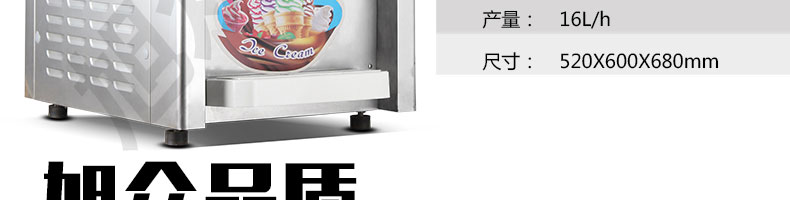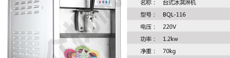 名稱BQL-116臺式冰淇淋機(jī) 電源220V 功率1.36kw 產(chǎn)量14-16L/H 尺寸520*600*680mm 重量70kg 規(guī)格 其他