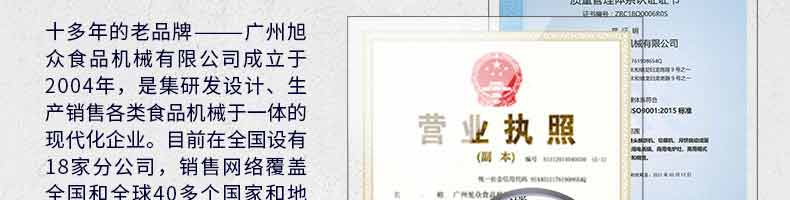 廣州旭眾食品機(jī)械有限公司是一家集科研開(kāi)發(fā),生產(chǎn)設(shè)計(jì),營(yíng)銷(xiāo)服務(wù)為一體的現(xiàn)代化生產(chǎn)企業(yè)。現(xiàn)代化生產(chǎn)車(chē)間,精湛制造技術(shù),所產(chǎn)機(jī)械歷經(jīng)市場(chǎng)重重考驗(yàn),不斷贏得海內(nèi)外客戶的贊譽(yù)。