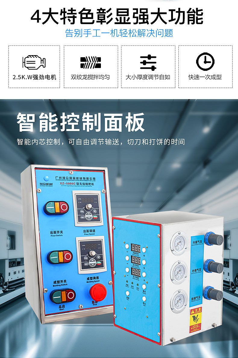 XZ-5000C糍粑機(jī),軟糯細(xì)膩、省時省力,不銹鋼糍粑機(jī)。智能控制面板,智能內(nèi)芯控制,可自由調(diào)節(jié)輸送,切刀和打餅的時間。拍扁刀切功能,具備氣缸打餅以及氣缸切刀的功能、又薄又準(zhǔn)確、可制作長條形的產(chǎn)品。