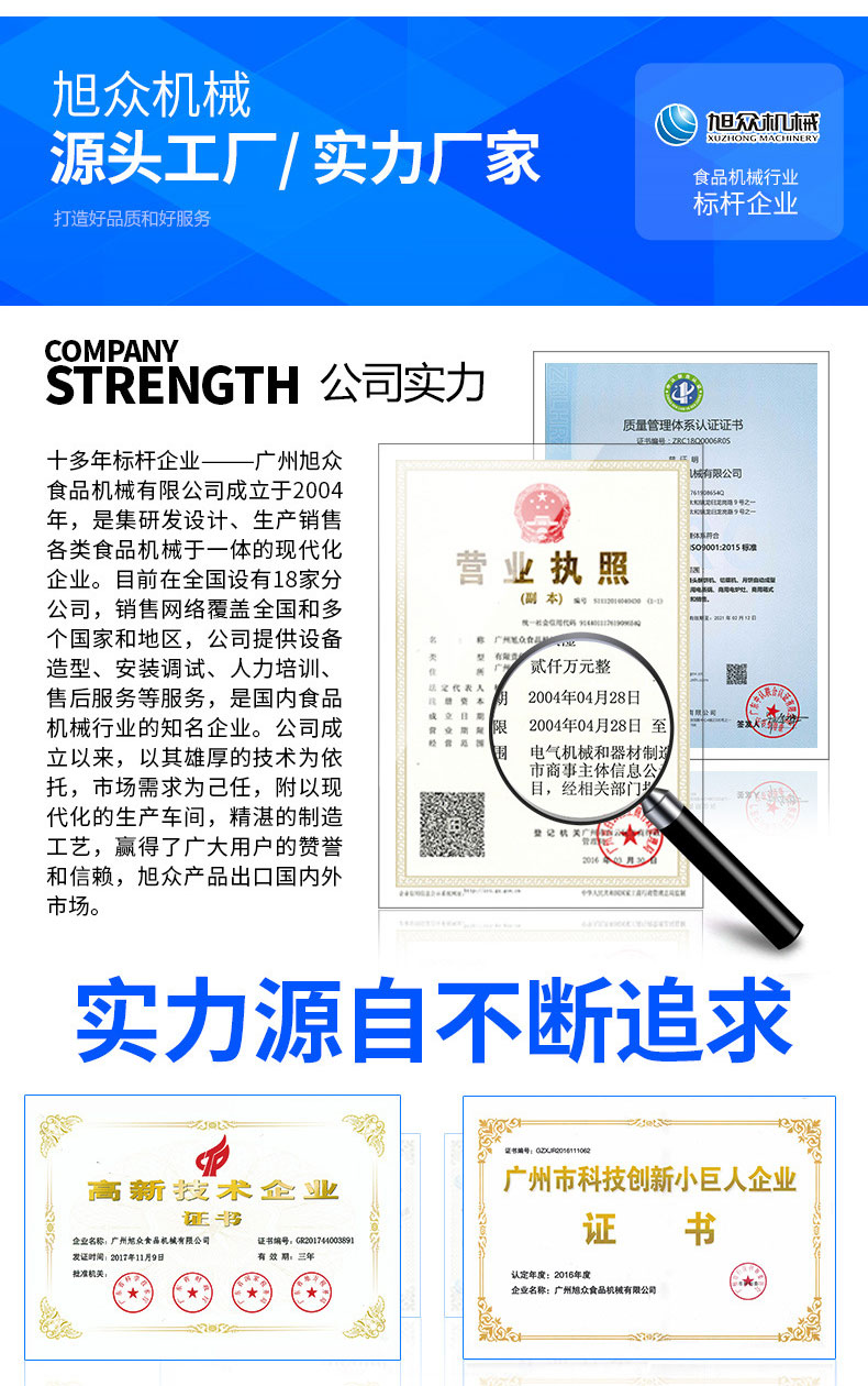 廣州旭眾食品機(jī)械有限公司是一家集科研開發(fā),生產(chǎn)設(shè)計(jì),營銷服務(wù)為一體的現(xiàn)代化生產(chǎn)企業(yè)。現(xiàn)代化生產(chǎn)車間,精湛制造技術(shù),所產(chǎn)機(jī)械歷經(jīng)市場重重考驗(yàn),不斷贏得海內(nèi)外客戶的贊譽(yù)。