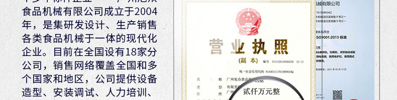 廣州旭眾食品機械有限公司是一家集科研開發(fā),生產設計,營銷服務為一體的現(xiàn)代化生產企業(yè)?,F(xiàn)代化生產車間,精湛制造技術,所產機械歷經市場重重考驗,不斷贏得海內外客戶的贊譽。