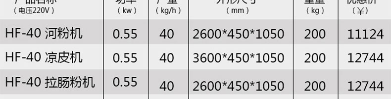 名稱(chēng)SZ-HF-40涼皮機(jī) 電源220/380V 功率0.75/19kw 產(chǎn)量16/24/32/40kg/h 尺寸主機(jī)尺寸2600*450*1050mm 外形尺寸2700*650*1500mm 重量200kg 規(guī)格粉條寬度mm:4/6/8/10 其他