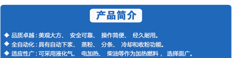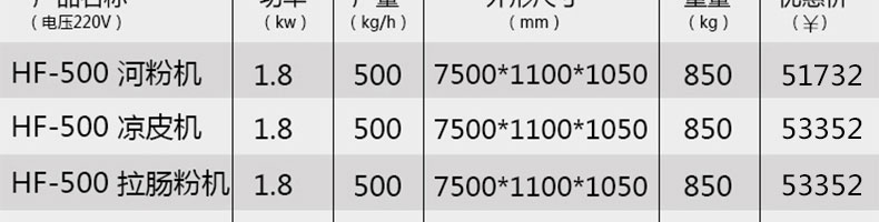 名稱SZ-HF-500涼皮機 電源220V 功率1.1kw 產(chǎn)量240/300/400/500kg/h 尺寸主機尺寸7500*1000*1050mm 外形尺寸7600*1200*1500mm 重量650kg 規(guī)格粉條寬度mm:4/6/8/10 其他