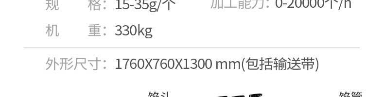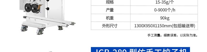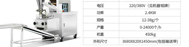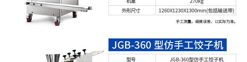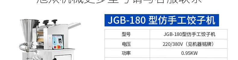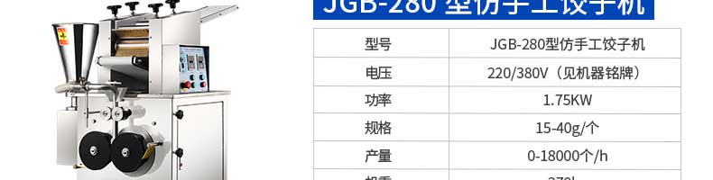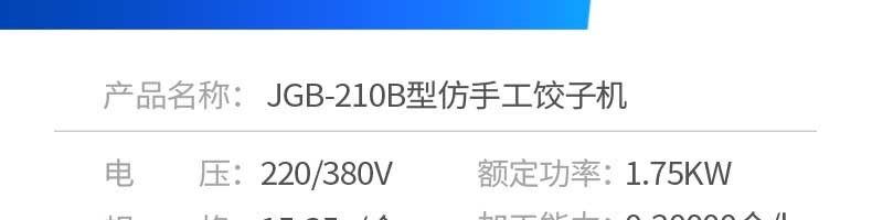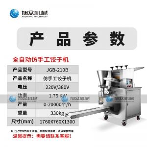 名稱JGB-210B仿手工餃子機(jī) 電源220/380v 功率1.75kw 產(chǎn)量0-20000個/h 尺寸1760*760*1300mm 重量330kg 規(guī)格15-35g/個 其他