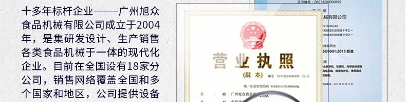 廣州旭眾食品機(jī)械有限公司是一家集科研開發(fā),生產(chǎn)設(shè)計(jì),營(yíng)銷服務(wù)為一體的現(xiàn)代化生產(chǎn)企業(yè)?,F(xiàn)代化生產(chǎn)車間,精湛制造技術(shù),所產(chǎn)機(jī)械歷經(jīng)市場(chǎng)重重考驗(yàn),不斷贏得海內(nèi)外客戶的贊譽(yù)。