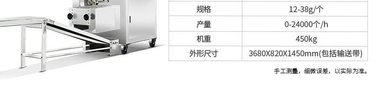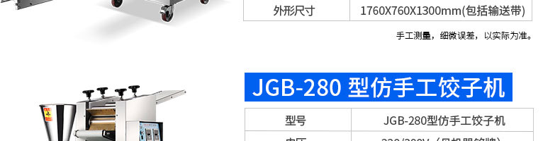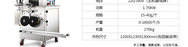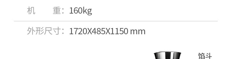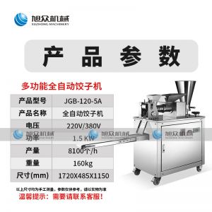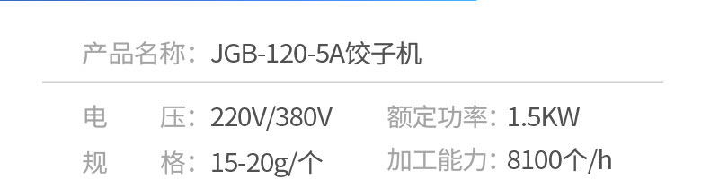 名稱120-5A餃子機(jī) 電源220/380v 功率1.5kw 產(chǎn)量8100個(gè)/h 尺寸1720*485*1150mm 重量160kg 規(guī)格15-20g/個(gè) 其他