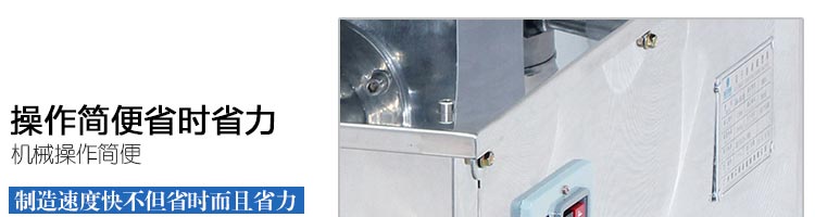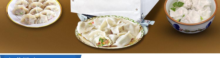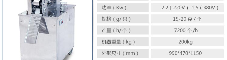 名稱JGB-120-5B型餃子機 電源220/380V(見機器名牌) 功率2.2kw(220V)1.5KW(380V) 產(chǎn)量7200個/小時 尺寸外形尺寸770*460*1190mm 重量200kg 規(guī)格15-20克/個 其他