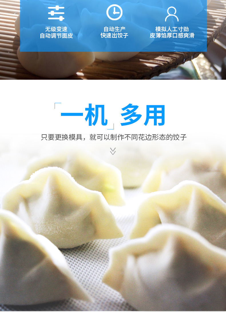名稱JGB-210型仿手工餃子機(jī) 電源220/380V(見(jiàn)機(jī)器名牌) 功率1.75kw 產(chǎn)量0-20000個(gè)/小時(shí) 尺寸外形尺寸2220*700*1300mm 重量330kg 規(guī)格15-35克/個(gè) 其他