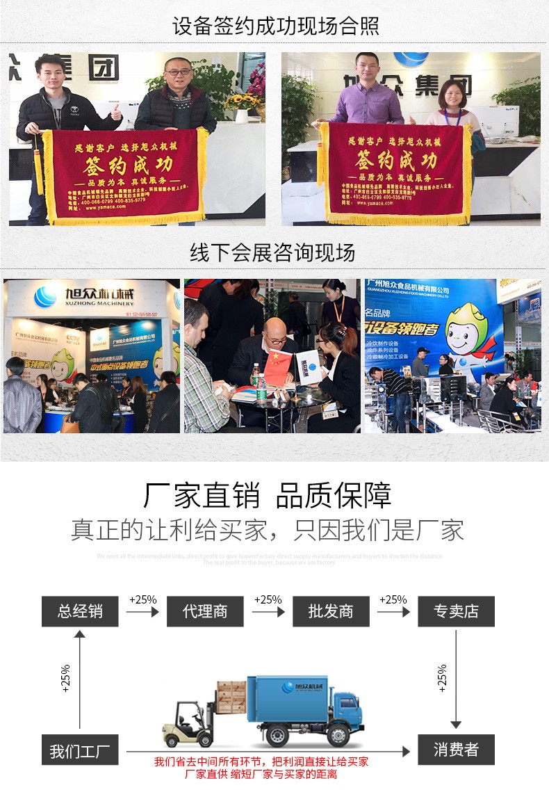廣州旭眾食品機(jī)械有限公司是一家集科研開(kāi)發(fā),生產(chǎn)設(shè)計(jì),營(yíng)銷(xiāo)服務(wù)為一體的現(xiàn)代化生產(chǎn)企業(yè)?,F(xiàn)代化生產(chǎn)車(chē)間,精湛制造技術(shù),所產(chǎn)機(jī)械歷經(jīng)市場(chǎng)重重考驗(yàn),不斷贏得海內(nèi)外客戶的贊譽(yù)。