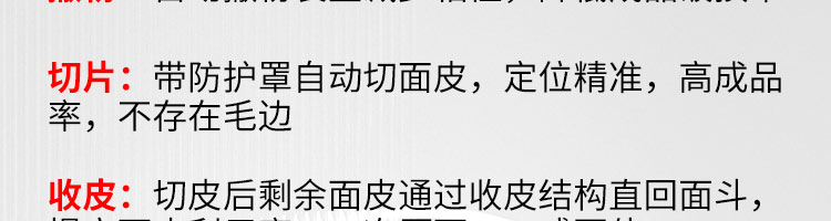 名稱JGB-10型一體式餃子機 電源單相220V/50HZ 功率4.7kW 產(chǎn)量生產(chǎn)速度:40-60個/分 尺寸1360X1480X1400長X寬X高mm) 重量700kg 規(guī)格氣源規(guī)格:0.4Mp;10L/分 其他