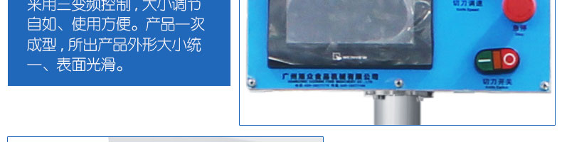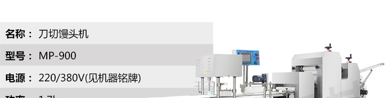 名稱MP900型刀切饅頭成型機 電源220/380V(見機器名牌) 功率1.7kw 產(chǎn)量2000-7200個/小時 尺寸3800*600*1450mm 重量450kg 規(guī)格10-250克/個 其他三段壓面