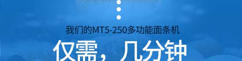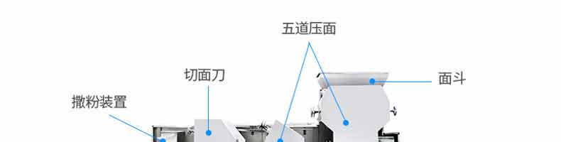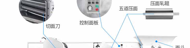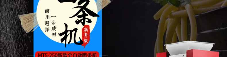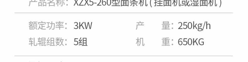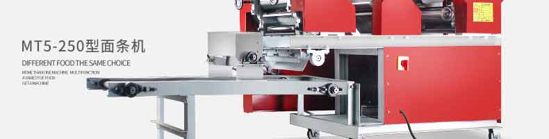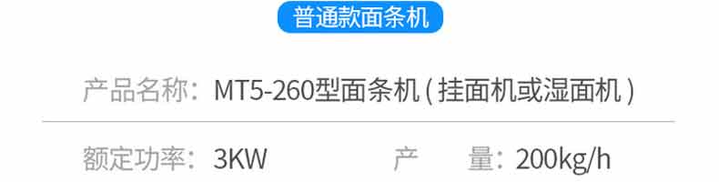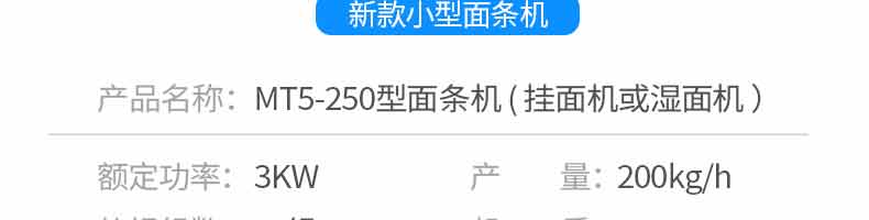 名稱MT5-250型面條機(jī) 電源220V 功率 產(chǎn)量200kg/h 尺寸2300*600*1400mm 重量450kg 規(guī)格 其他軋輥組數(shù):五組;軋輥尺寸:98*260mm