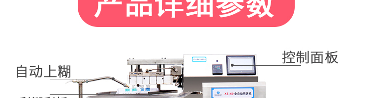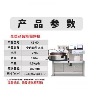 名稱XZ-60全自動煎餅機 電源220v 功率320w 產(chǎn)量4.5kg/h 尺寸1230*670*1010mm 重量 規(guī)格 其他