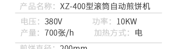 名稱XZ-400型滾筒煎餅機(jī) 電源380v 功率10kw 產(chǎn)量700張/h 尺寸1800*750*1050mm 重量 規(guī)格 其他