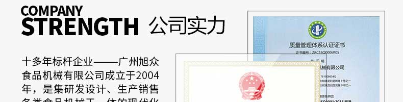 廣州旭眾食品機械有限公司是一家集科研開發(fā),生產(chǎn)設計,營銷服務為一體的現(xiàn)代化生產(chǎn)企業(yè)?,F(xiàn)代化生產(chǎn)車間,精湛制造技術,所產(chǎn)機械歷經(jīng)市場重重考驗,不斷贏得海內(nèi)外客戶的贊譽。
