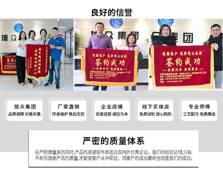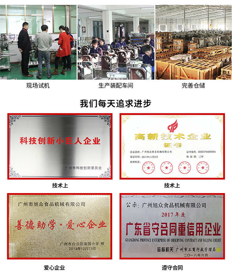 廣州旭眾食品機械有限公司是一家集科研開發(fā),生產設計,營銷服務為一體的現(xiàn)代化生產企業(yè)?,F(xiàn)代化生產車間,精湛制造技術,所產機械歷經市場重重考驗,不斷贏得海內外客戶的贊譽。