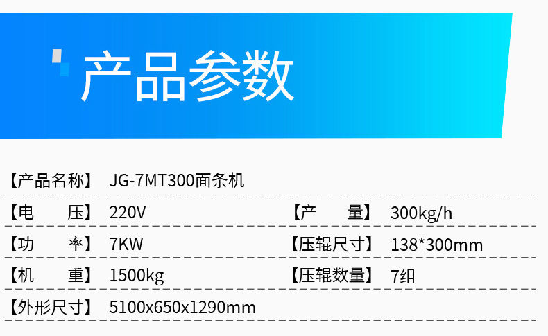 名稱JG-7MT300面條機(jī) 電源220V 功率7KW 產(chǎn)量300kg/h 尺寸5100×650X1290mm 重量1500kg 規(guī)格請(qǐng)資詢銷售員 其他