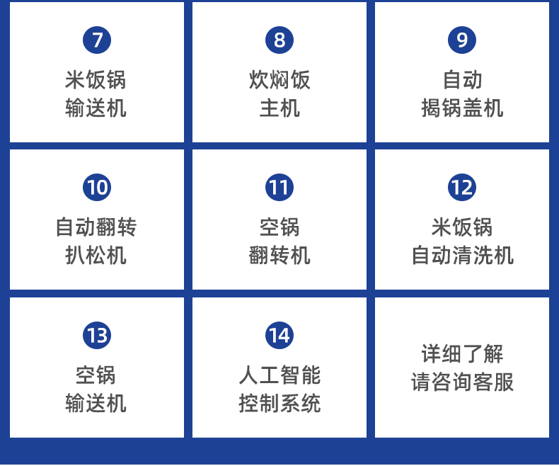 名稱機械手全自動米飯生產(chǎn)線 電源 380V 功率13KW 產(chǎn)量各型號不一,請咨詢銷售員 尺寸各型號不一,請咨詢銷售員 重量各型號不一,請咨詢銷售員 規(guī)格各型號不一,請咨詢銷售員 其他