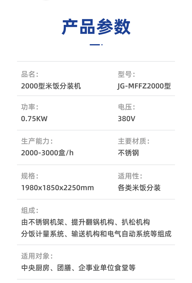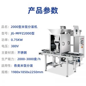 名稱米飯分裝機(jī) 電源380V 功率0.75KW 產(chǎn)量2000-3000盒/h 尺寸1980X1850X2250mm 重量請咨詢銷售員 規(guī)格請咨詢銷售員 其他