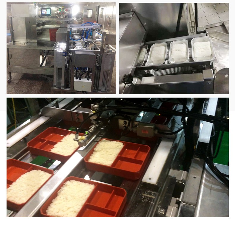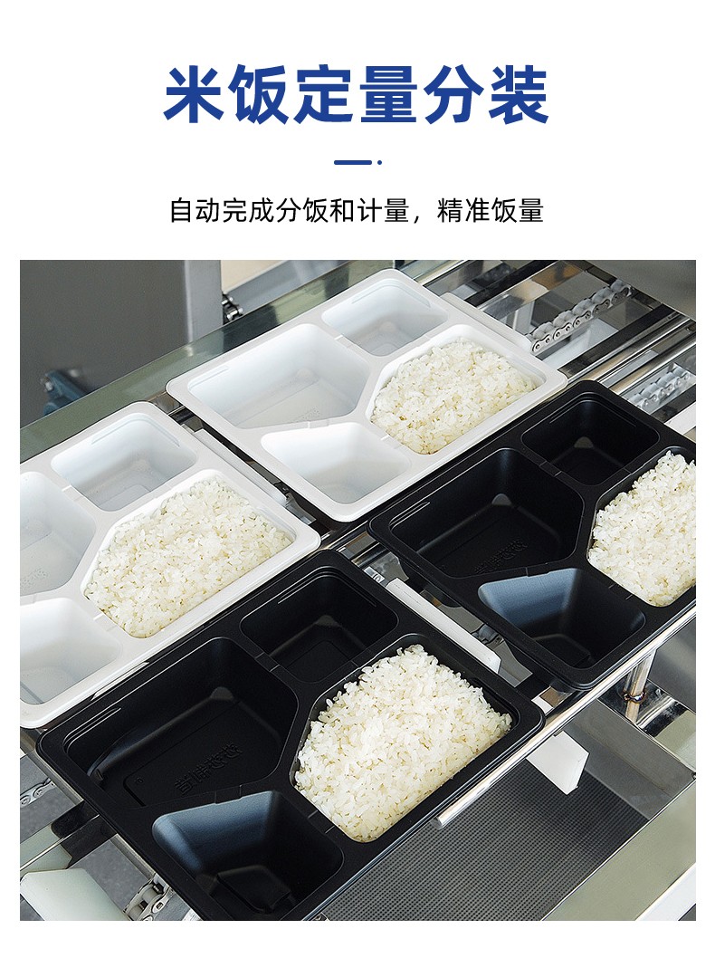 米飯分裝機(jī),適用多場合大型米飯加工中心、快餐公司、大型配餐中心企事業(yè)單位、學(xué)校食堂、釀造企業(yè)。米飯定量分裝,自動(dòng)完成分飯和計(jì)量,精準(zhǔn)飯量。米飯先扒松再分盒,能將米飯扒松分盒,使米飯更加松軟可口。