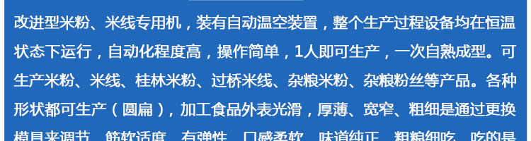 SZ-30米粉機,生產(chǎn)多樣性可生產(chǎn)米粉、米線、粉絲、粉條、、年糕、玉米面條、各種雜糧粉絲、各種面條、雜糧面條、彩色面條以及以紅薯、玉米、大豆、蠶豆等制成淀粉為原料的等多種食品而且每種食品厚薄、粗細等規(guī)格可根據(jù)需要任意調(diào)整。