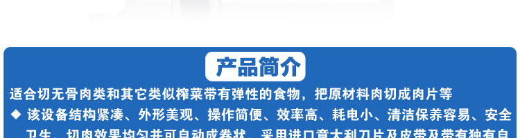 臺(tái)式全自動(dòng)切片機(jī),適合切無(wú)骨肉類(lèi)和其他類(lèi)似榨菜帶有彈性的食物,把原材料肉切成肉片,并可自動(dòng)成卷狀??汕信H馄?、羊肉片等