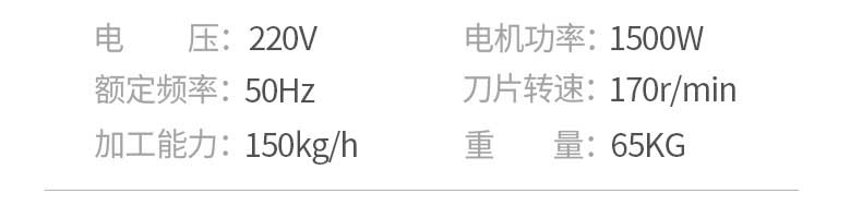 名稱(chēng)XZ-7單切機(jī) 電源220V 功率電機(jī)功率:1500W 產(chǎn)量加工能力:150kg/h 尺寸進(jìn)口尺寸:60X125mm外形尺寸:426X360X795mm 重量65KG 規(guī)格額定頻率:50Hz 其他刀片轉(zhuǎn)速:170r/min