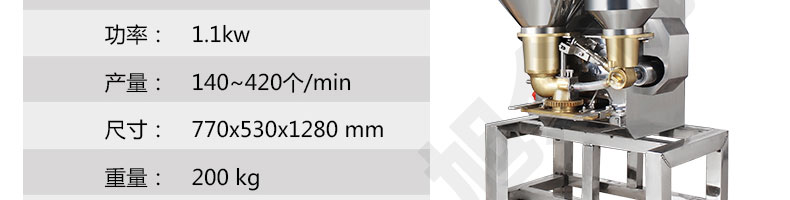 名稱SZ-602包心肉丸機(jī) 電源220/380V(見機(jī)器銘牌) 功率1.1kw 產(chǎn)量140-420個(gè)/分鐘 尺寸770*530*1280mm 重量200kg 規(guī)格 其他