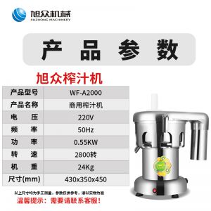 名稱(chēng)WF-A2000商用榨汁機(jī) 電源220V 功率0.55kw 產(chǎn)量轉(zhuǎn)速:2800r/min 尺寸430*350*450mm 重量26kg 規(guī)格 其他