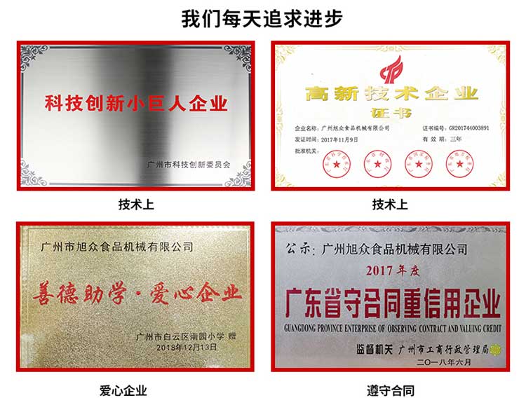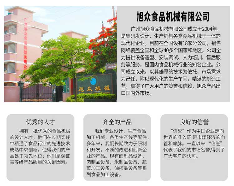 廣州旭眾食品機(jī)械有限公司是一家集科研開(kāi)發(fā),生產(chǎn)設(shè)計(jì),營(yíng)銷(xiāo)服務(wù)為一體的現(xiàn)代化生產(chǎn)企業(yè)?,F(xiàn)代化生產(chǎn)車(chē)間,精湛制造技術(shù),所產(chǎn)機(jī)械歷經(jīng)市場(chǎng)重重考驗(yàn),不斷贏得海內(nèi)外客戶的贊譽(yù)。