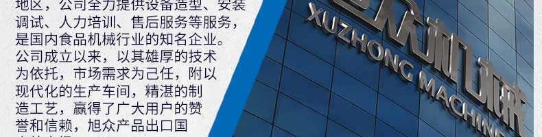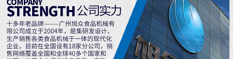 廣州旭眾食品機械有限公司是一家集科研開發(fā),生產(chǎn)設計,營銷服務為一體的現(xiàn)代化生產(chǎn)企業(yè)。現(xiàn)代化生產(chǎn)車間,精湛制造技術,所產(chǎn)機械歷經(jīng)市場重重考驗,不斷贏得海內外客戶的贊譽。
