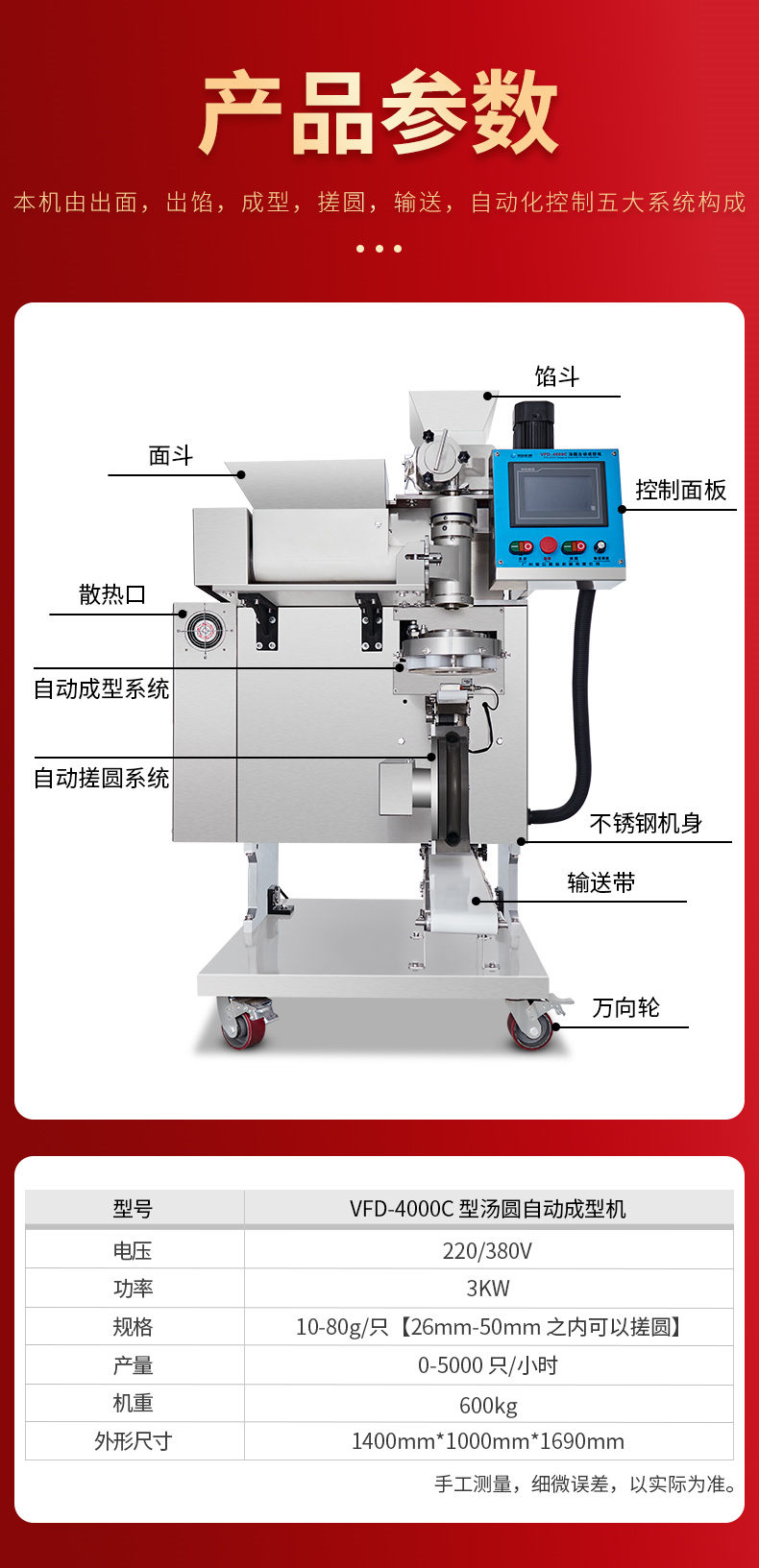 名稱4000C湯圓機 電源220/380V 功率3KW 產(chǎn)量0-5000只/小時 尺寸1400mm*1000mm*1690mm 重量600kg 規(guī)格10-80g/只【26mm-50mm之內(nèi)可以搓圓】 其他
