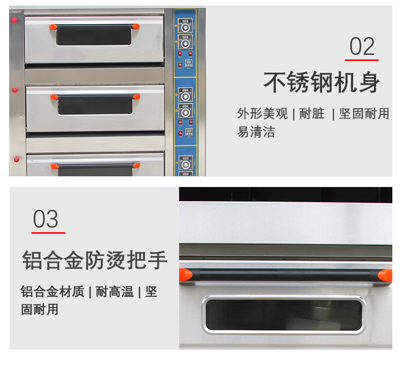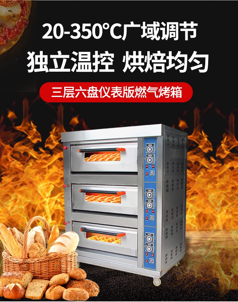 名稱三層六盤儀表版燃氣烤箱 電源220V 功率0.3KW 產(chǎn)量 尺寸1340*908*1690mm 重量300KG 規(guī)格三層六盤 其他