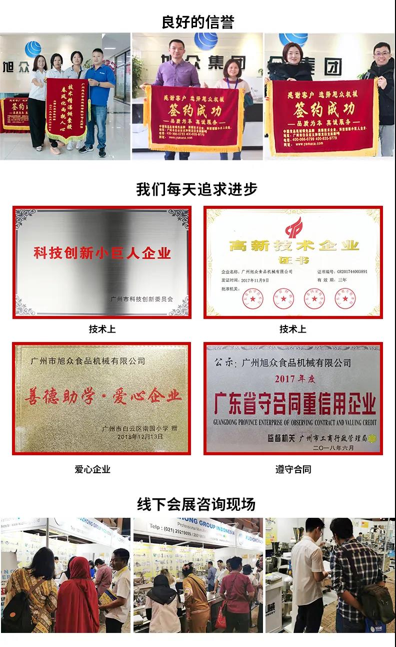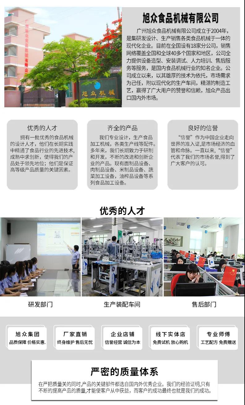 廣州旭眾食品機(jī)械有限公司是一家集科研開發(fā),生產(chǎn)設(shè)計(jì),營銷服務(wù)為一體的現(xiàn)代化生產(chǎn)企業(yè)?,F(xiàn)代化生產(chǎn)車間,精湛制造技術(shù),所產(chǎn)機(jī)械歷經(jīng)市場重重考驗(yàn),不斷贏得海內(nèi)外客戶的贊譽(yù)。