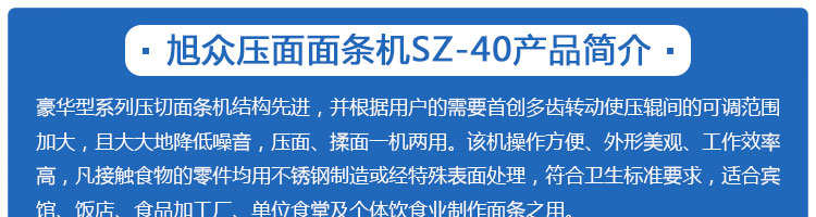 SZ-50、SZ-70壓面面條機系列,本機壓面、揉面一機兩用,用于制作面條、云吞皮、糕點、面點等食品,生產(chǎn)的產(chǎn)品韌性大、耐煮、不易斷,適合于賓館、飯店、食堂、面包廠及各類面點加工單位或個體商戶使用。
