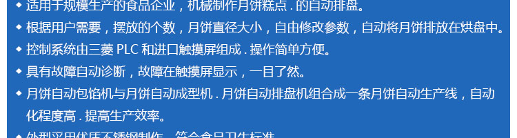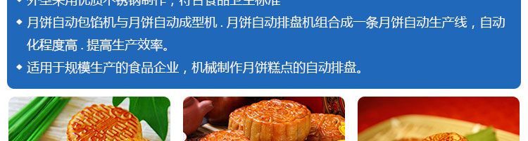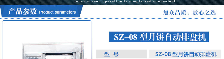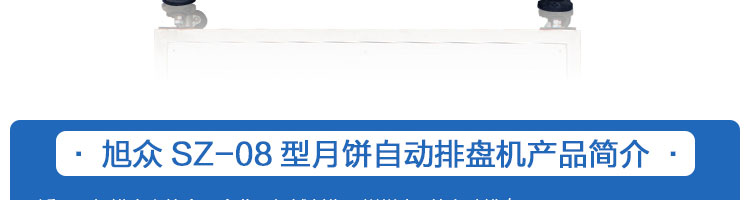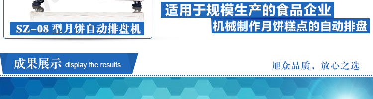SZ-08型月餅自動(dòng)排盤機(jī),可同于制作各種月餅。適用于蛋糕房、休閑食品廠、食品加工產(chǎn)、面包房、月餅加工廠、超市、學(xué)校、食堂等各種工作場所。可滿足不同客戶群體。免費(fèi)提供工藝技術(shù)。