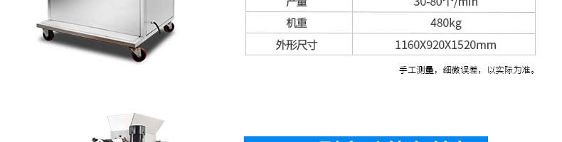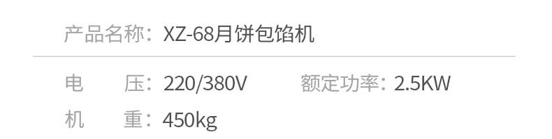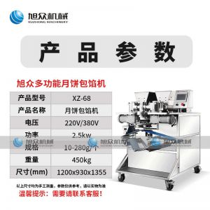 名稱XZ-68月餅包餡機(jī) 電源220/380V 功率2.5KW 產(chǎn)量各型號(hào)不同,請(qǐng)咨詢銷售員 尺寸1200X930×1355mm 重量450kg 規(guī)格各型號(hào)不同,請(qǐng)咨詢銷售員 其他