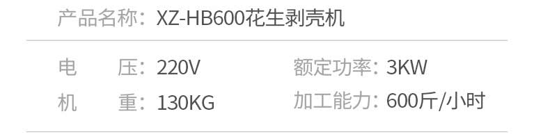名稱(chēng)花生脫殼機(jī) 電源220V 功率3kw 產(chǎn)量600斤/h 尺寸1200×680×1650mm 重量130kg 規(guī)格 其他