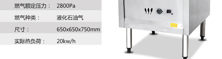 名稱蒸包爐 電源220V 功率20kw 產(chǎn)量 尺寸650*650*750mm 重量25kg 規(guī)格 其他燃氣種類:液化石油氣;燃氣額定壓力:2800Pa