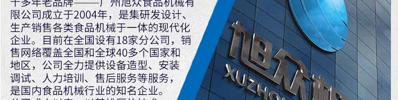 廣州旭眾食品機(jī)械有限公司是一家集科研開發(fā),生產(chǎn)設(shè)計(jì),營(yíng)銷服務(wù)為一體的現(xiàn)代化生產(chǎn)企業(yè)?,F(xiàn)代化生產(chǎn)車間,精湛制造技術(shù),所產(chǎn)機(jī)械歷經(jīng)市場(chǎng)重重考驗(yàn),不斷贏得海內(nèi)外客戶的贊譽(yù)。
