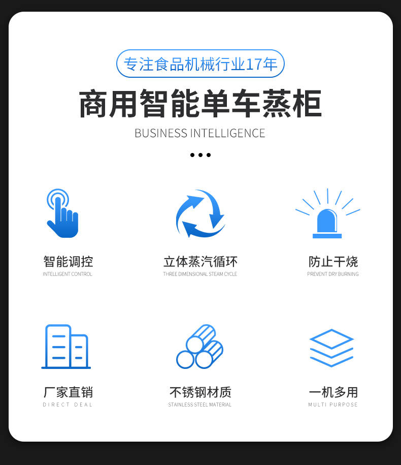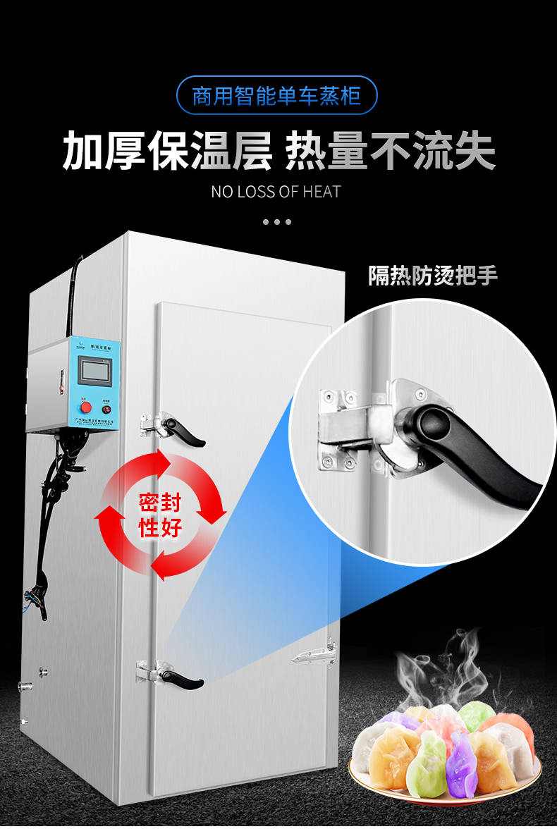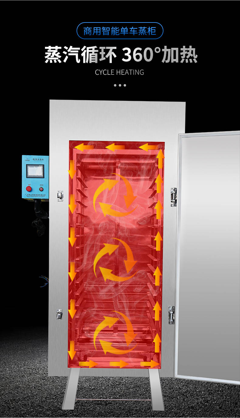 單車蒸柜,整機(jī)不銹鋼材質(zhì)本機(jī)由內(nèi)膽殼、保溫層、外護(hù)板組成,整機(jī)采用優(yōu)質(zhì)不銹鋼,加上硅膠密封及硅酸鋁保溫材料,堅固、耐用、保溫效果好,外形美觀。循環(huán)均勻發(fā)熱,專門用于發(fā)熱管干燒空氣,溫度任意調(diào)節(jié),讓食物口感怡到好吃