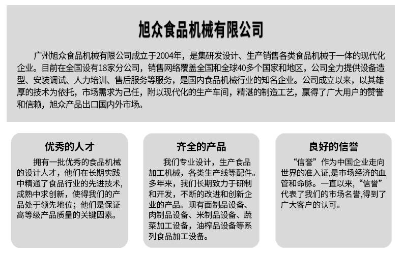 廣州旭眾食品機(jī)械有限公司是一家集科研開發(fā),生產(chǎn)設(shè)計,營銷服務(wù)為一體的現(xiàn)代化生產(chǎn)企業(yè)?,F(xiàn)代化生產(chǎn)車間,精湛制造技術(shù),所產(chǎn)機(jī)械歷經(jīng)市場重重考驗(yàn),不斷贏得海內(nèi)外客戶的贊譽(yù)。